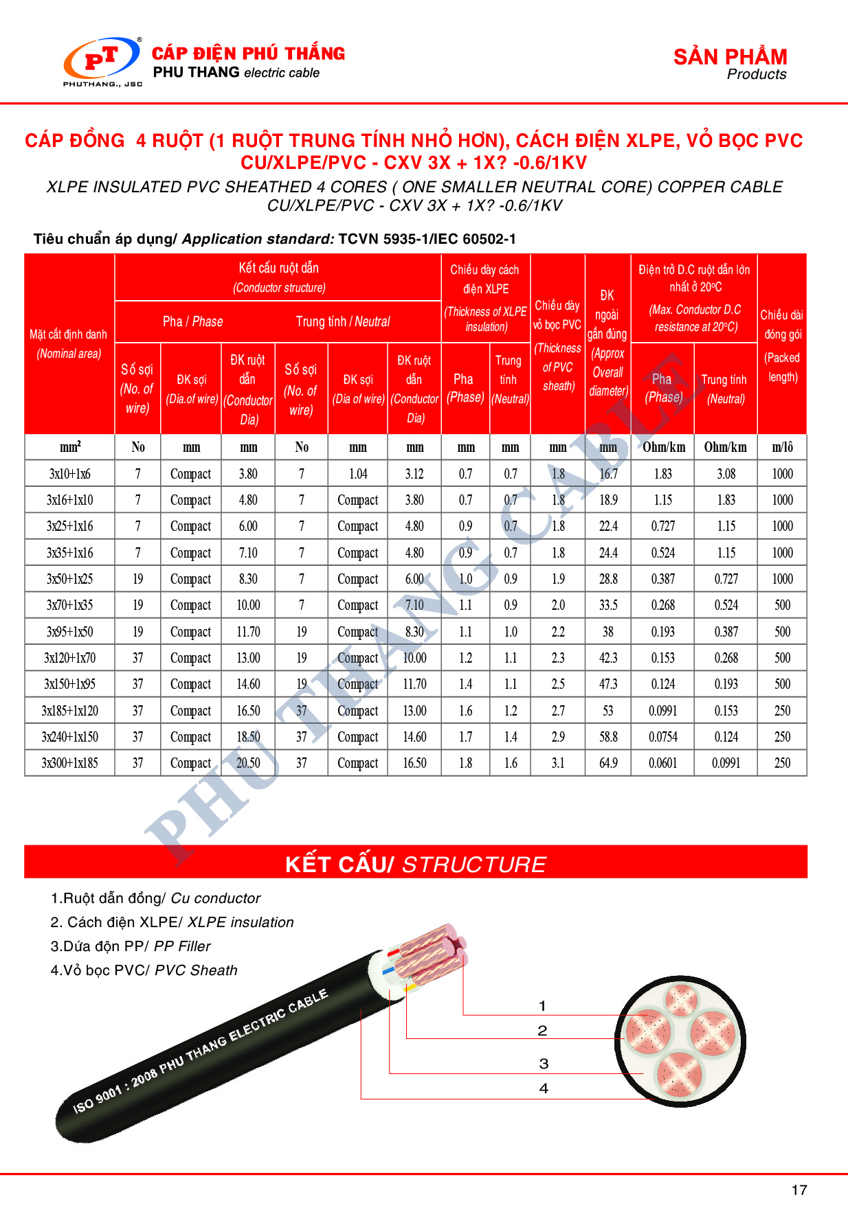 - Kết cấu, kích thước theo tiêu chuẩn TCVN 5935-1995/ IEC502.