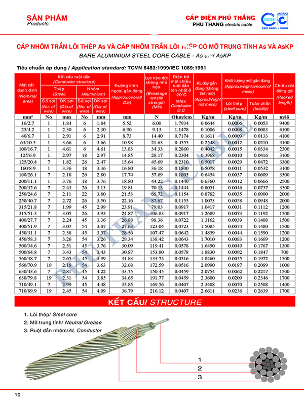 + Ruột dẫn: Nhôm 99,7% và Thép mạ kẽm
