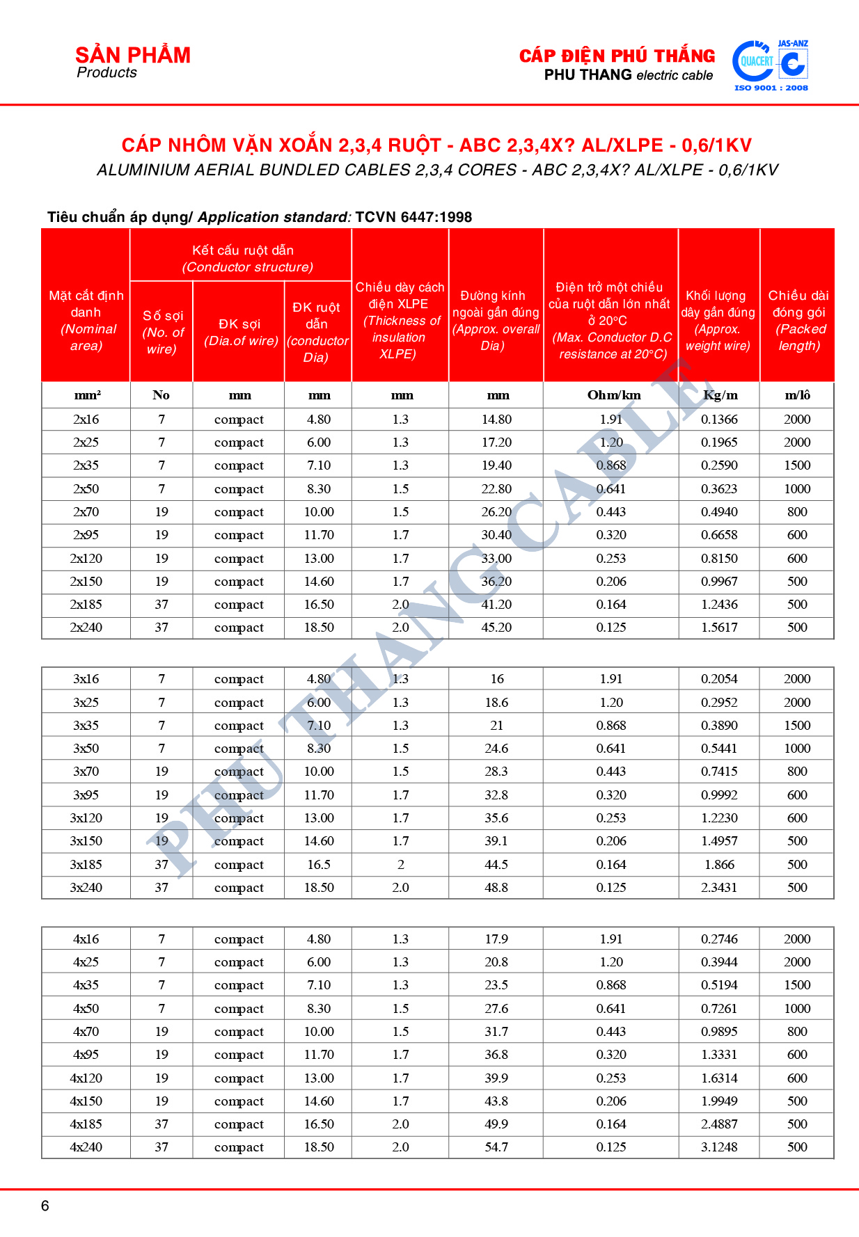 - Mặt cắt danh định của ruột dẫn: từ 10 mm2 đến 240 mm2